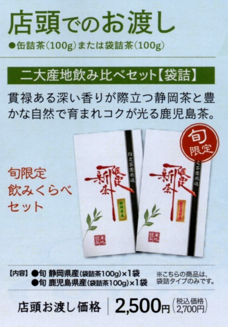 静岡新茶・鹿児島新茶 飲み比べセット 入荷後、店頭でお渡し致します。 (「飲みくらべセット」は深蒸し茶タイプになります。)