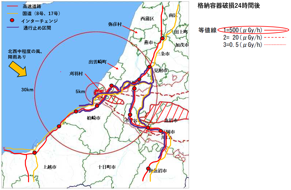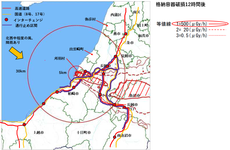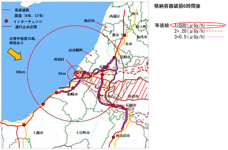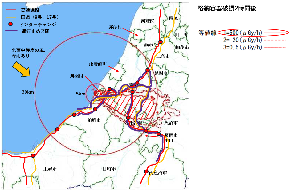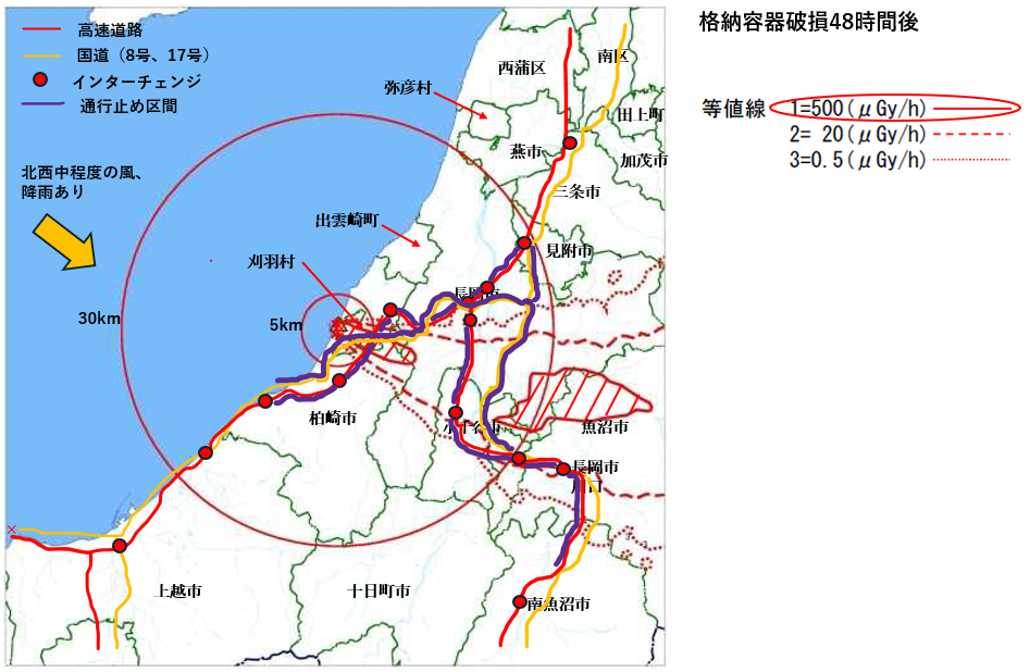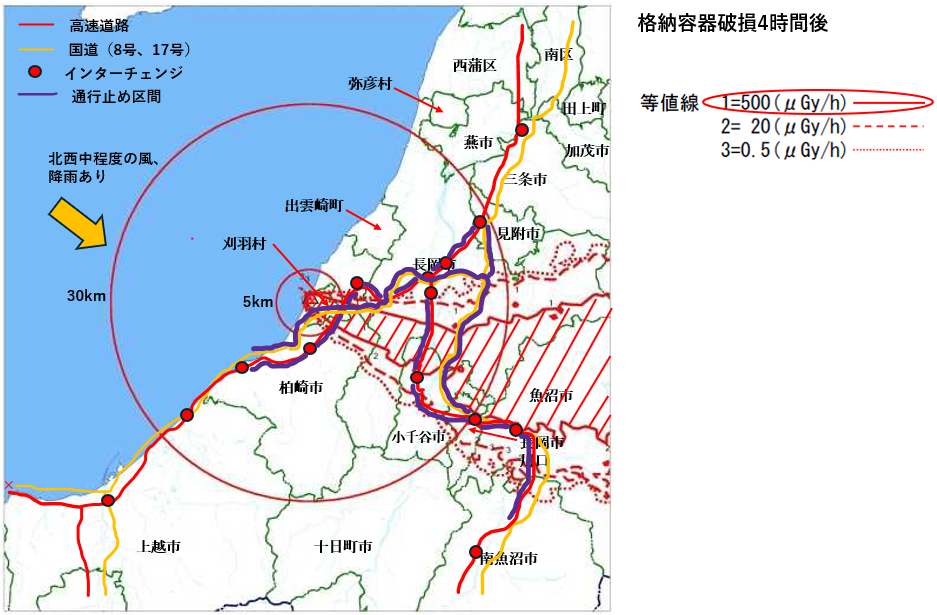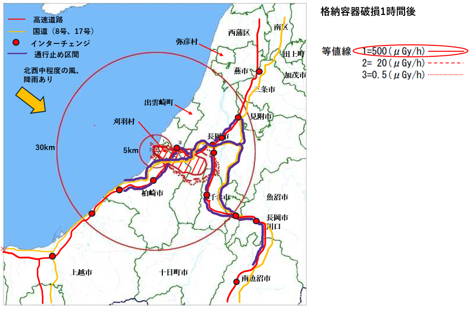 道路渋滞と柏崎刈羽原発の事故が重なった場合の放射性物質の拡散について考えます。
