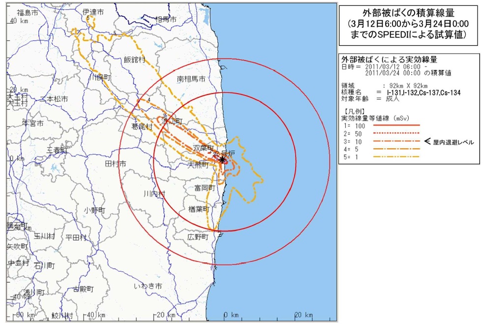 | 警戒区域 | 実測値の赤色の部分の積算線量は、実測値の空間線量率(19.0μSv/h)とシミュレーションの時間(282時間)の積として得られ5.4mSvになる。 | シミュレーション結果で5.4mSvに対応する部分は、凡例の3(10mSv、橙色の一点鎖線)と4(5mSv、濃黄色の一点鎖線)の間の線で囲まれる部分になり、原発から始まって浪江町を通り飯館村の南端近くで終わっている。この部分は実測値の赤色の部分とほぼ同じ大きさであり向きもほぼ同じである。 |