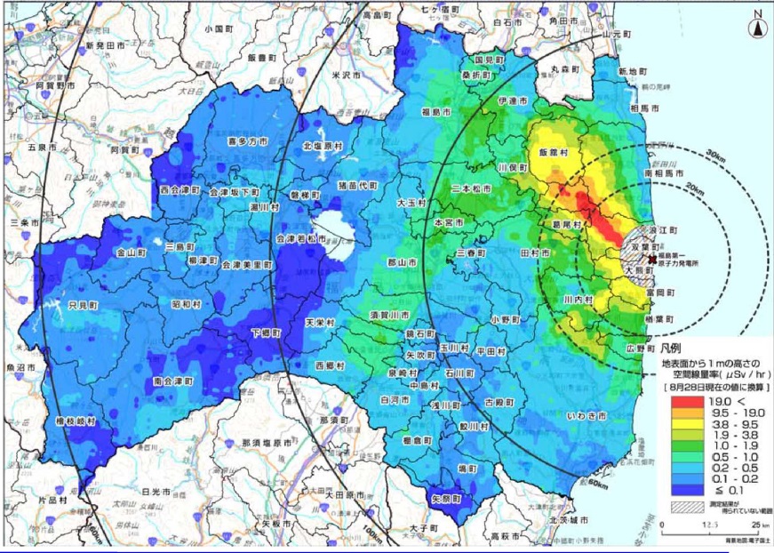 | 1,2,3号機(発電容量合計約200万kW、燃料集合体合計1,456体)の格納容器破損、放射性物質が直接放出された。 | 航空機モニタリング、地表面から1mの高さの空間線量率を測定 |