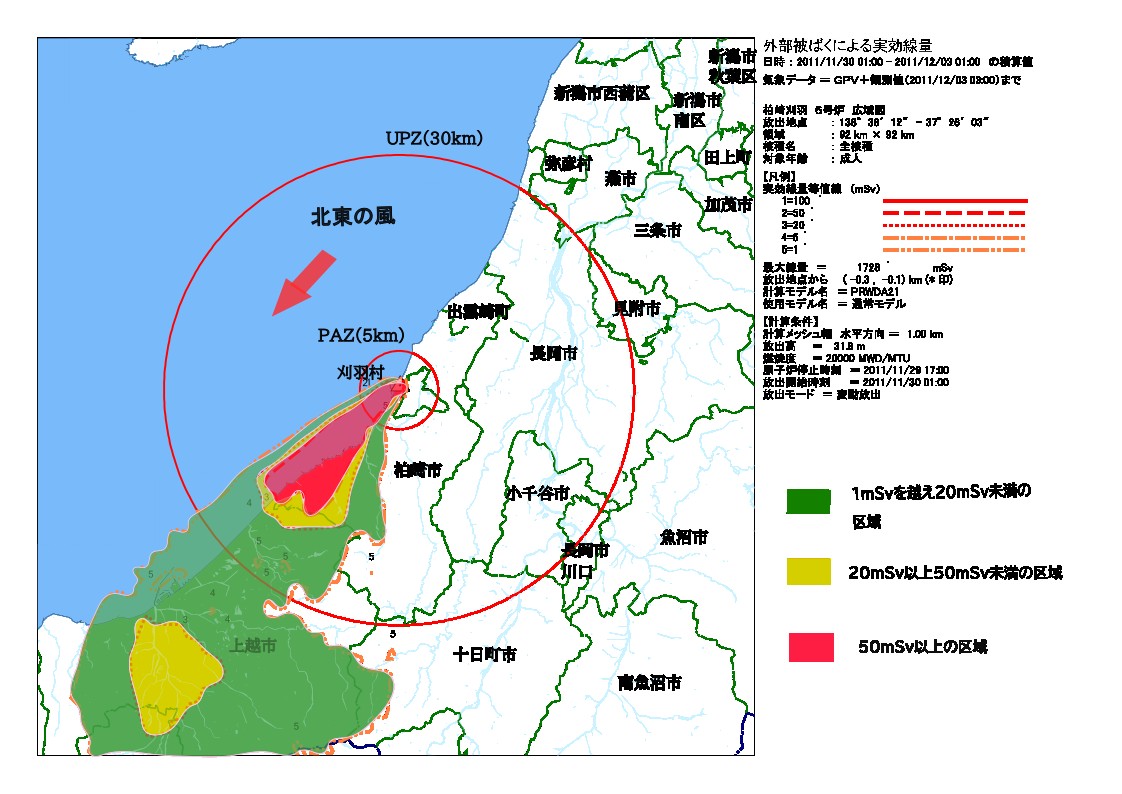 ①50mSvを越える帰還困難区域は、原発から北東方向の刈羽村北部及び柏崎市北部まで伸びている。