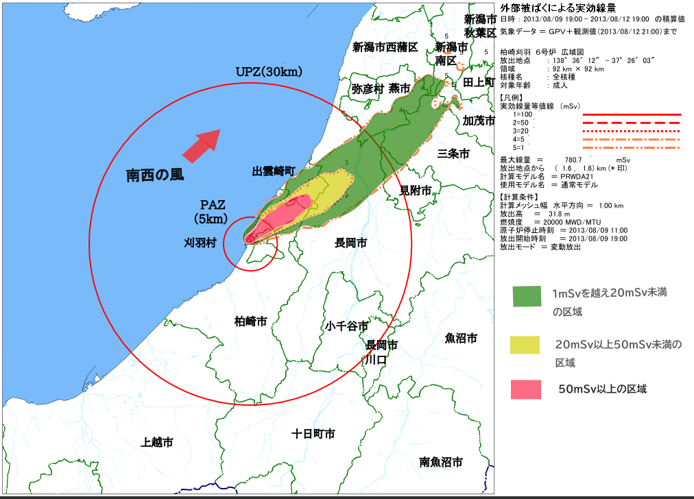 新潟県は柏崎刈羽原発6号機が重大事故を起こした場合のシミュレーションを実施しました。6号機の出力は、福島第一原発で事故を起こした1~3号機の出力の約半分に相当します。しかし、シミュレーションの結果が示すように、この規模であっても放射性物質による汚染は広範囲に及びます。