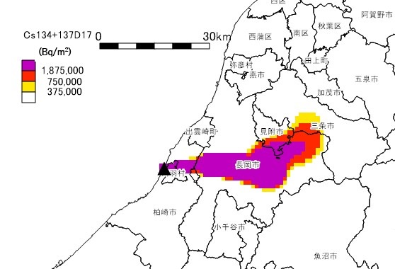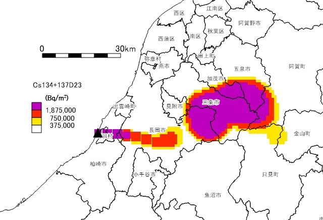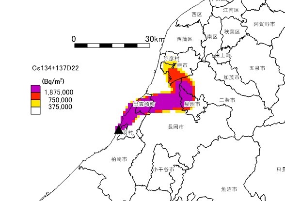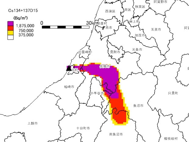 | 原発から幅を広げながら東に伸びる。長岡市の中心部を通り原発から約30㎞の地点で南下し、長岡市と魚沼市の境界付近で終わる。 | 長岡市と魚沼市の境界付近から魚沼市の西端を南下し、南魚沼市に超えた付近で終わる。 | 魚沼市と南魚沼市の、(b)を囲む幅約3kmの区域。 |