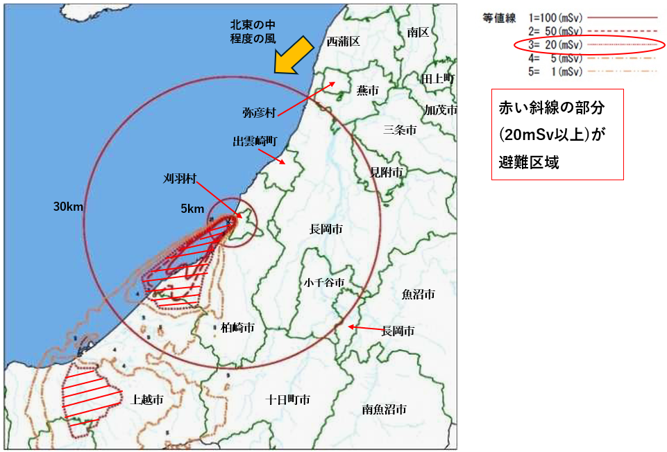 北西の風が吹くときは放射性物質が原発の東側にある長岡市から魚沼方面に飛来する可能性が高くなります。