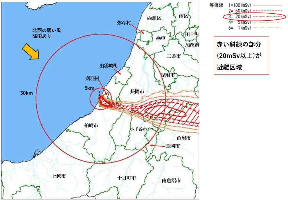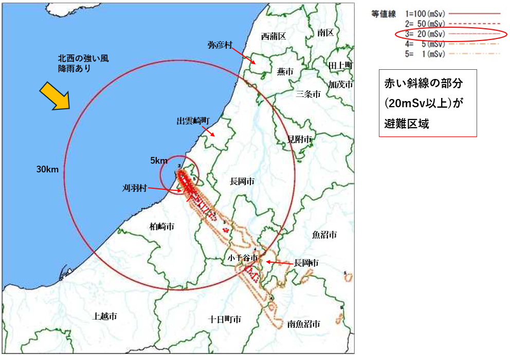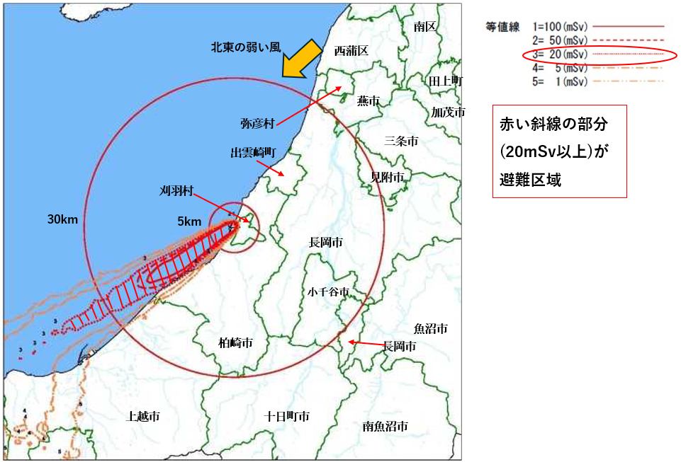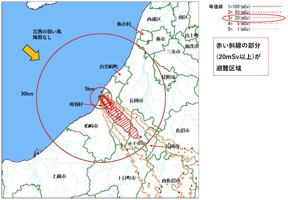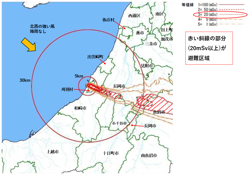 | 結果 | 避難区域は原発から北東方向30㎞、長岡市と燕市の境界付近まで伸びている。 |