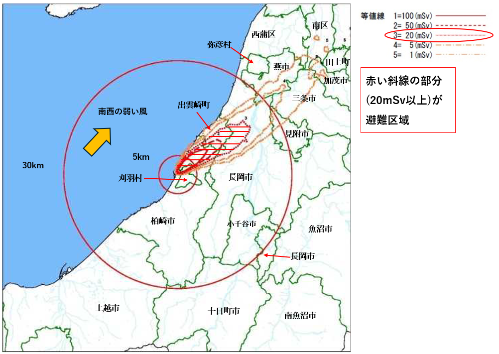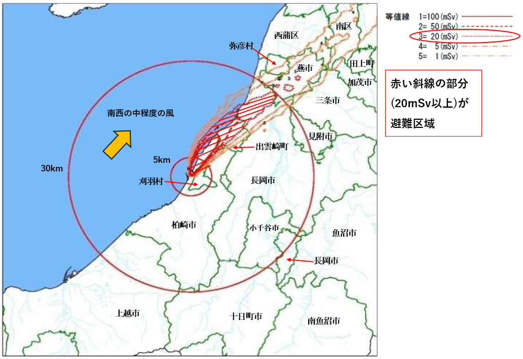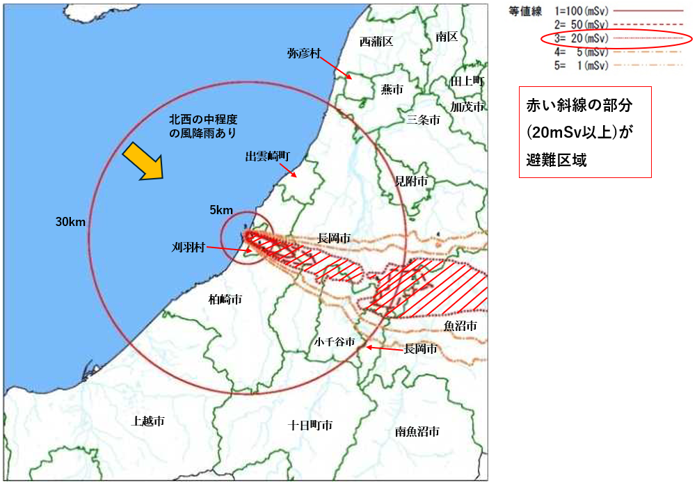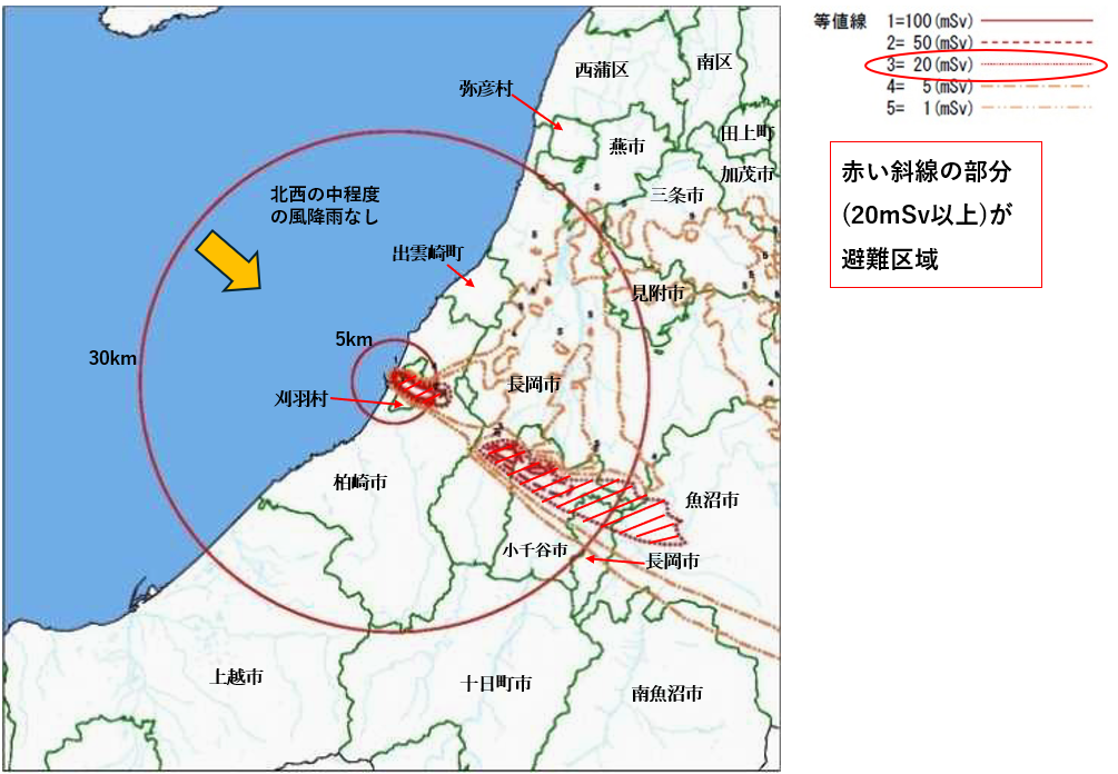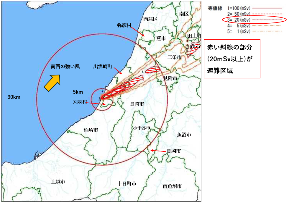 | 結果 | 避難区域は原発から北東方向30㎞、長岡市と燕市の境界付近まで伸びている。 |